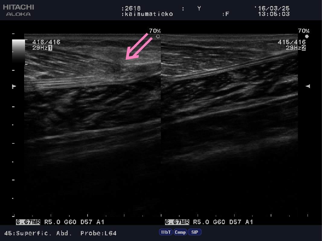 ピンクの矢印部分、筋繊維の断裂部分が、
