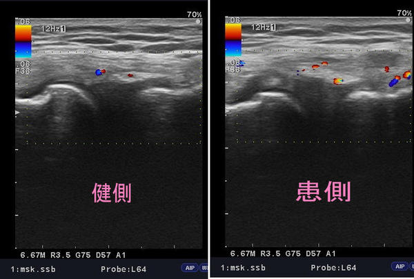 これは、損傷した靱帯を修復しようと血行が豊富で、血流からも靱帯部が損傷していることがわかります。