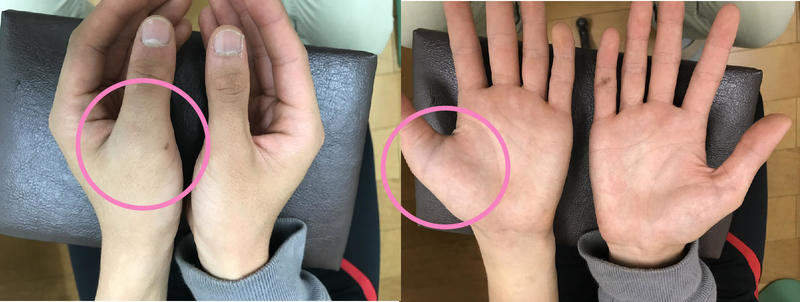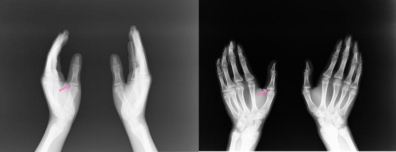 やはり骨折・・・親指の基節骨の付け根が折れていました。