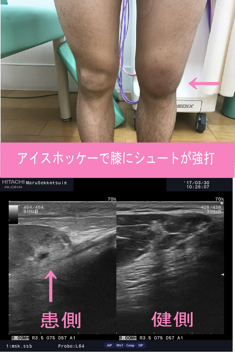 膝にパックが強打し受傷。