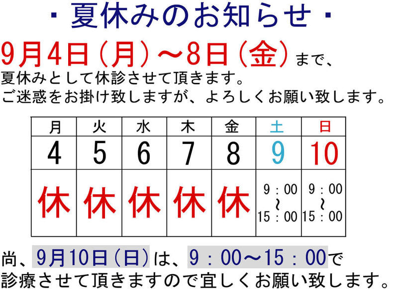 尚、10日(日)は日曜日でございますが、9:00 ~ 15:00で診療させて頂きます。