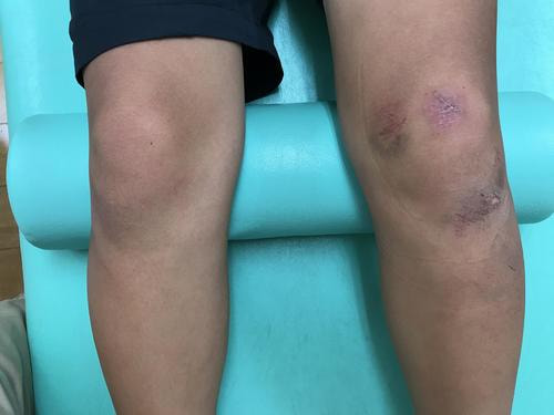 膝のお皿の内側上部が大きく腫れ、内出血も出ています。