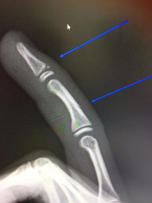 結果、中指の中節骨部に亀裂、末節骨骨端軟骨部にも異常を確認。。。