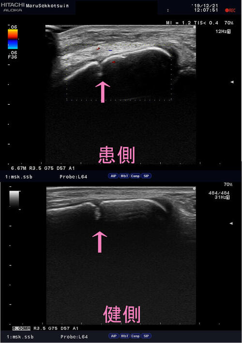 レントゲン撮影をすると骨の端っこに隙間の様に見えます。
