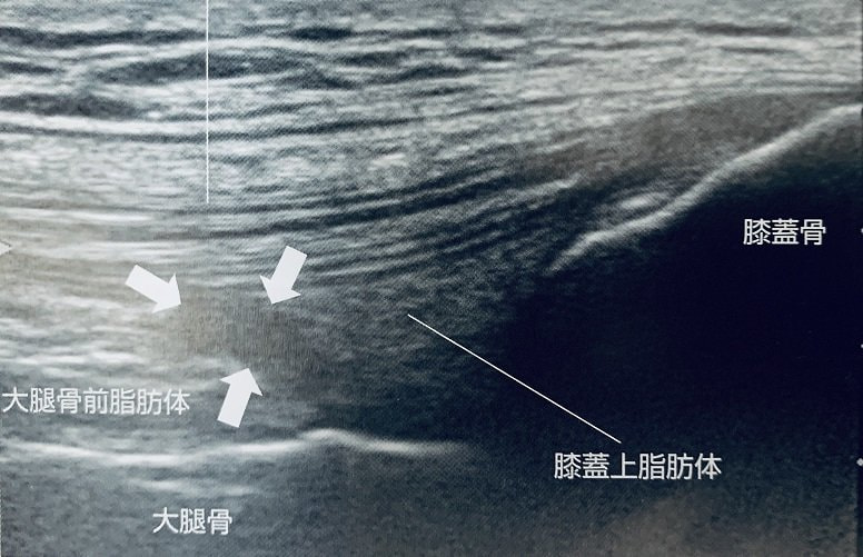 膝関節の周りには大腿前脂肪体,膝蓋上脂肪体,膝蓋下脂肪体と呼ばれる脂肪組織があり、