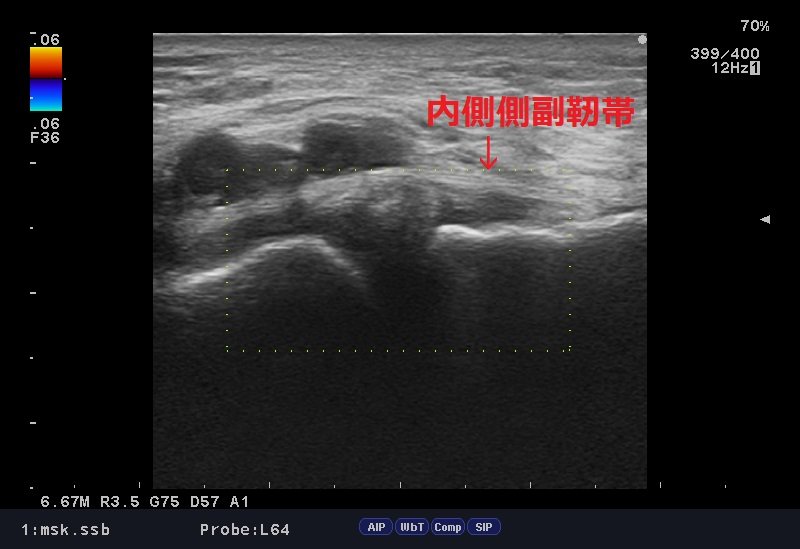 エコー検査では内側側副靭帯周囲、関節内の腫脹が診られ、結果「膝内側側副靭帯損傷」の疑い。