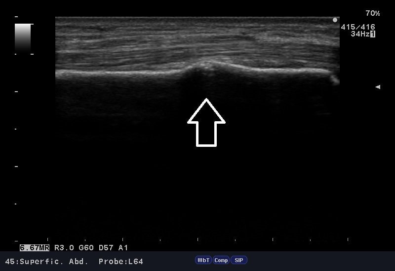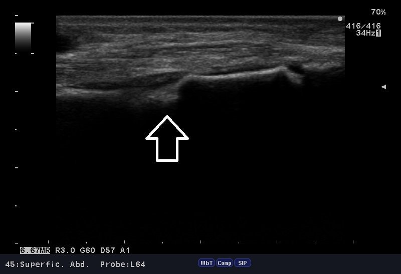 腫れ具合から骨折の有無はある程度予想できますが、エコー検査は骨折の箇所を的確にその場で確認でき、骨癒合を促進させるマイオパルス(MYO PULSE)という治療器で、治療を行えるので強い味方です。