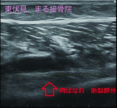 下のエコー画像、ふくらはぎの筋腹内に断裂部分(空洞部分)が診られ、特殊な撮影方法で出血度合も確認できます。