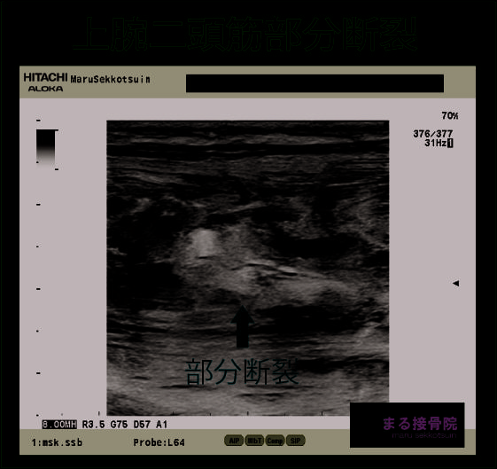 しっかり触診後、超音波画像診断装置、エコーで検査したところ、上腕二頭筋筋腹の部分断裂と判明。