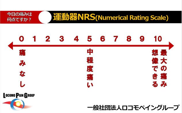 (0が痛みなし、10が想像できる最大の痛みとして、 0~10までの11段階に分けて、現在の痛みがどの程度かを指し示す段階的スケールです。)