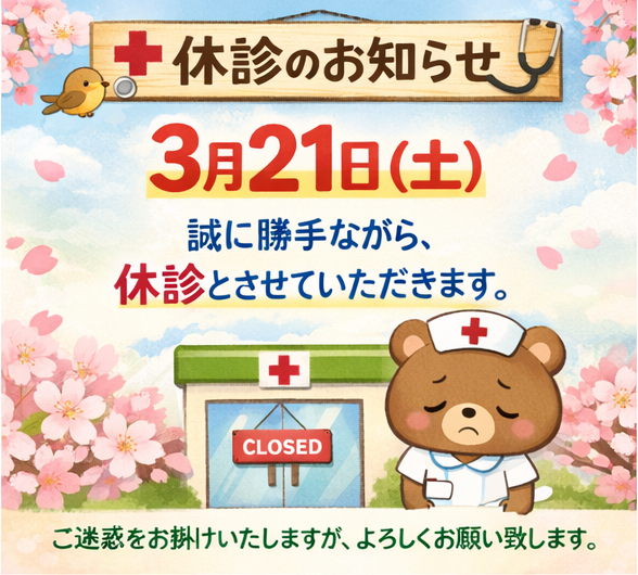 3月21日(土)は誠に勝手ながら、休診とさせていただきます。