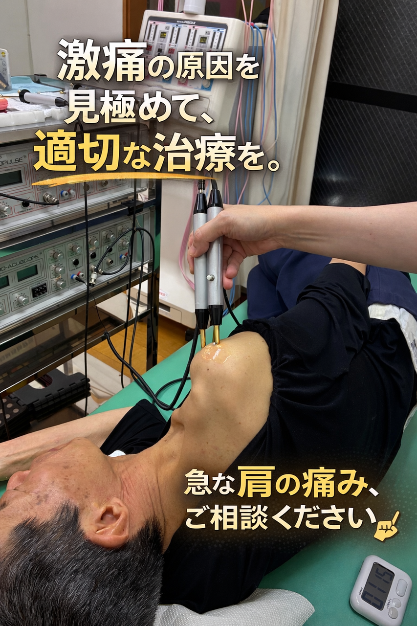 「四十肩(肩関節周囲炎)」と診断され、可動域を広げる施術や筋肉をほぐす処置を受けたとのことでした。