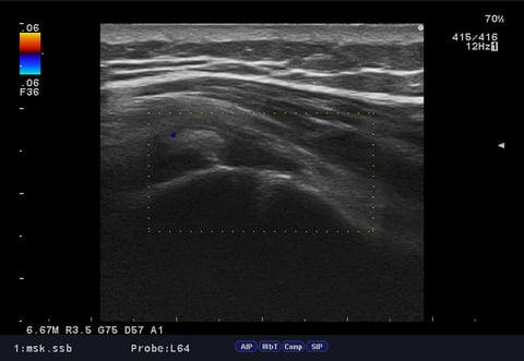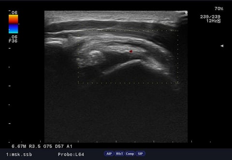 **強い圧痛と腫脹(腫れ)**が確認され、一般的な四十肩とは異なる所見が見られました。
